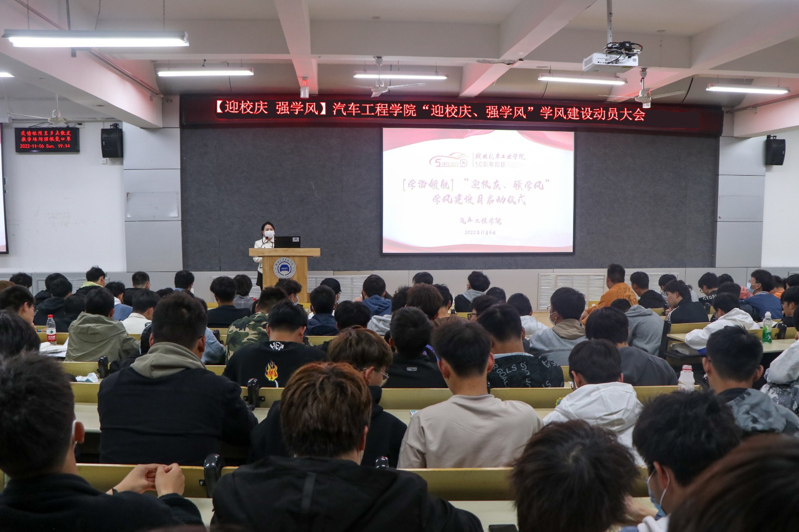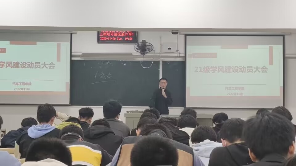 william威廉11月6日晚在6113报告厅、5201教室分年级召开以“迎校庆、强学风”为主题的学风建设动员大会。william威廉学工办主任胡霄寒、辅导员李键雯、李旭、甘甜以及车院全体员工参加了此次活动。
