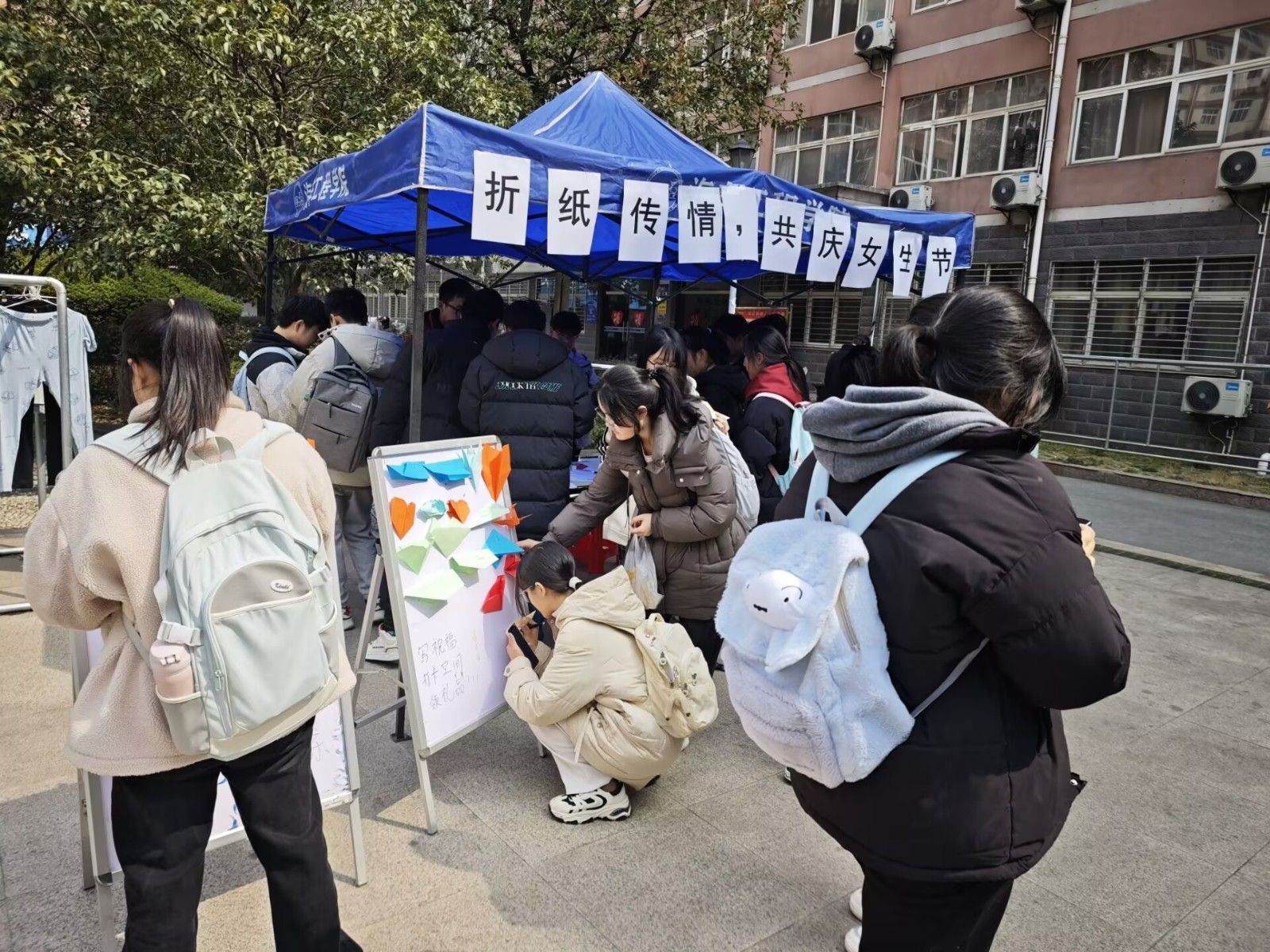 活动现场,五彩斑斓的彩纸铺展成一片“创意海洋”。指导人员组成教学小组,从基础折纸技法入手,带领参与者们制作千纸鹤、玫瑰花、立体爱心等作品。参与者们还纷纷将祝福语写在纸上,表达对女性的赞美、对友谊的珍视以及对女性权益的关注等。“折纸不仅是技艺,更是心意的传递。我们希望每位同学都能通过作品表达对女生的祝福。”活动负责人朱同学表示。这些承载着温暖话语的折纸作品被精心布置,拼成“女生节快乐”等字样,成为校园里一道亮丽的风景。