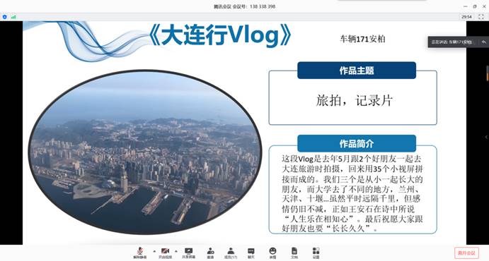 活动从4月上旬开始到,整体分为三个阶段进行。初赛阶段,通过网络投票方式从征集到的60多个视频作品中评选出10个作品进入决赛。决赛环节,选手们通过QQ课堂用3-5分钟时间结合PPT将创作作品的主题与内容、剪辑手法、创意点呈现给评委。最后,在综合评委的评分表决下,车服191班安婷同学的《回归的信念》凭借着唯美的古风形象和动人的故事情节征服全场荣获比赛一等奖。而其他作品也都是用心之作,车服171安柏同学的《大连行vlog》按照时间顺序,从多个角度分享了自己在大连的旅程,表达了“读万卷书、行万路路,每一次旅行都是人生的成长”的感怀;车辆192班张嘉瑞同学的《潼》分享了家乡的风光和日落美景,镜头中都是家乡无法忘却的一草一木,人与自然和谐相处之美感油然而生。在第三个阶段,william威廉1819级全体员工受邀参加了获奖作品的展播,大家相聚bilibili直播平台,共同欣赏优秀作品,点击量达3000人次。