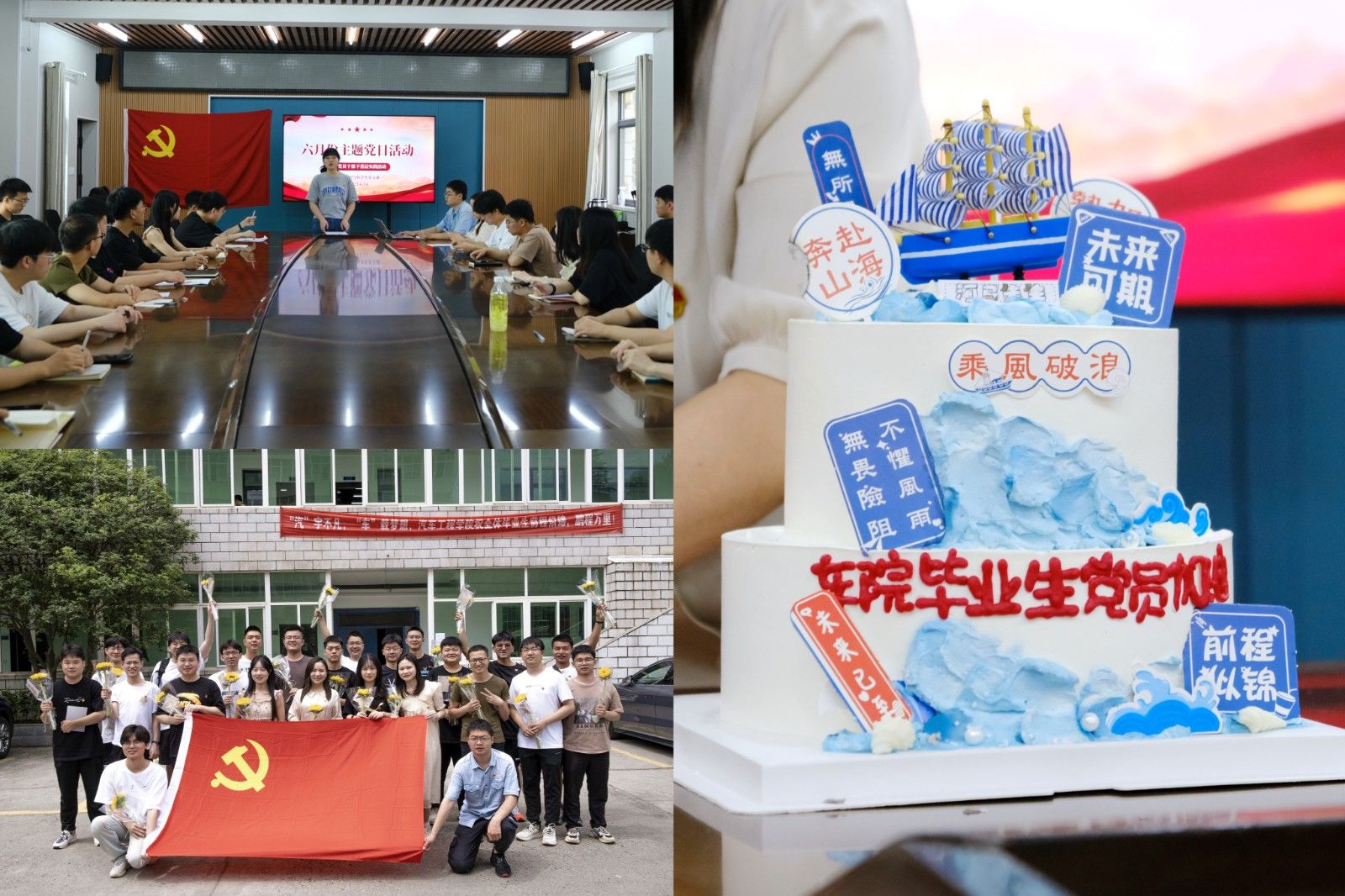 “三言两语”寄真情,毕业生党员们依次发言,有的表达对公司、老师的真诚感谢,有的分享大学期间难忘经历,还有传授参加竞赛和提高学习成效的经验……预备党员陆致远、刘汶汶分别献上《入海》《凤凰花开的路口》两首歌,以表达对毕业生党员的祝福。在歌曲尾声,胡霄寒老师为每一名毕业生党员们送上鲜花、明信片,并切分祝福蛋糕,轻松而温馨的氛围让不少毕业生党员潸然泪下。