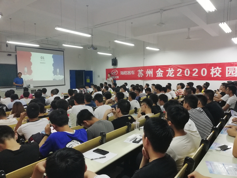 宣讲会上,人事招聘经理陈恒虎向同学们详细阐述了苏州金龙企业文化、行业背景、招聘需求、薪资待遇、晋升渠道等,激情昂扬的介绍让现场求职的员工热血沸腾,感受到了苏州金龙“融合创新,务实拼搏”的企业精神。他还表示公司将为每一位员工建立一个公正、公平的工作环境,积极提升个人能力全方位学习的浓厚氛围,矢志与员工一起分享公司成长带来的快乐,期待汽院的优秀毕业生加入到苏州金龙的大家庭中。经过热烈的互动,现场投递纸质简历60余份、电子简历若干。在9月10日的两轮面试、选拔之后,苏州金龙在汽车大院二楼会议室与车院15名优秀毕业生签订了就业意向书。