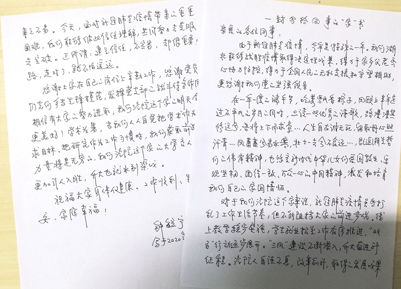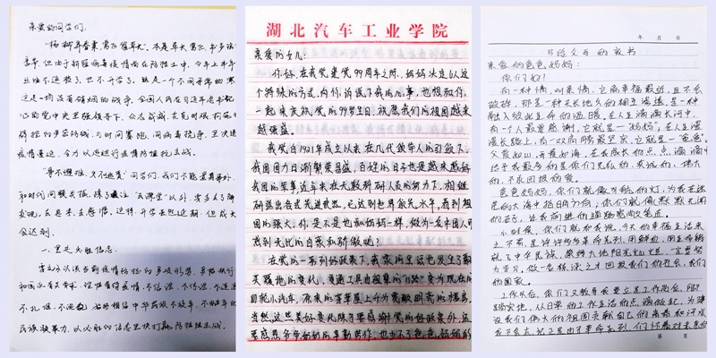 二支部书记樊继东也把家书写给了员工,告诉同学们“事不避难、义不逃责”,在疫情常态化防控形势下要坚定理想信念、保持良好心态、坚持认真自学、增进家人感情。副教授高伟在给父母的家书中深深感恩父母的培养,把父母比作自己人生的灯塔和铺路石,认为父母的教诲情深意切、受益终身,并将牢记父母教诲继续发扬工匠精神、好好教书育人。公司办公室孙永硕通过家书向女儿讲述抗疫故事,引导女儿充分理解中国共产党的领导力量与国家日益强大、人民生活日益美好等之间的关系,与女儿约定要一起学习、一起努力。