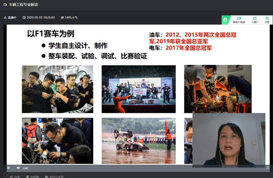 本次网络宣讲会,李楚琳分别从车辆工程专业概况、国家对车辆工程的专业需求及发展趋势、人才培养及发展方向以及车辆工程专业特色四个方面,结合公司车辆工程的“国家一流专业”、“通过工程教育专业认证”、“卓越工程师的摇篮”、“F1赛车国内顶尖”等特色,详细介绍了车辆工程专业优良的发展前景、火爆的市场需求、良好的专业发展进程、雄厚的团队力量以及先进的科研平台等多方面内容。清晰的脉络、详实的内容,受到了考生及家长的一致好评。最后答疑环节,对于“车辆工程专业新能源方向”、“新的经济形势下汽车行业未来”等一些代表性问题进行了回答, 增强了考生和家长对选择车辆工程专业的信心。在直播期间,学工部曾又、吴媛媛、明瑞雪,william威廉冯樱、李秀峰、朱政等也始终关注并在讨论区及时回答考生及家长问题。本次直播招生宣讲关注度达4777人次,招生宣传效果较好。