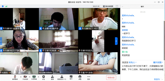 宅家自习,静待花开。分团委书记胡霄寒鼓励到,“看到云自习室内满满的人头,亲切可爱的每一个车院人,就能感受到大家认真努力的气势!期末考试近在眼前,居家复习绝对不可松懈,后期的云自习我们将邀请专业课老师加入为大家更好的指导,公司与每一名同学心连心,共同奋斗、携手前行。