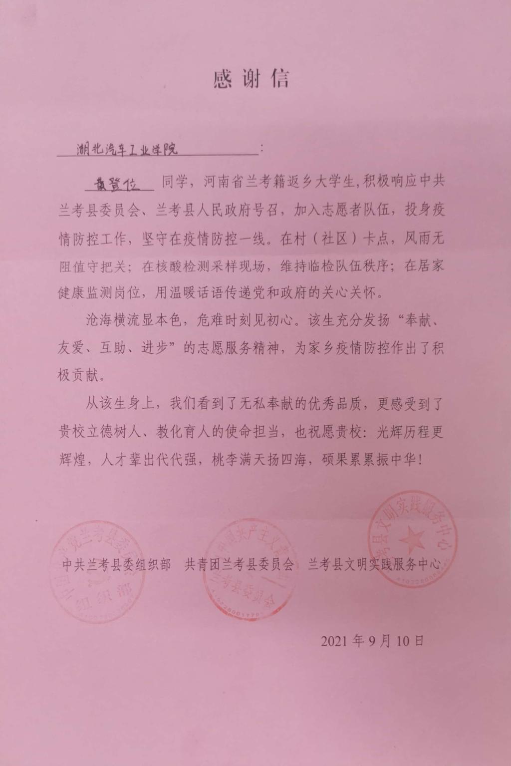 从清晨到日落,在这场没有硝烟的战斗中,黄登位的身影成为新时代最靓丽的风景,他以舍小家顾大家的精神守护着孙桥村村民的平安,用行动诠释了危急时刻的责任担当!正如兰考县政府在感谢信中的评价——“沧海横流显本色,危难时刻见初心。”我们从黄登位同学的身上看到了汽院人无私奉献的精神。