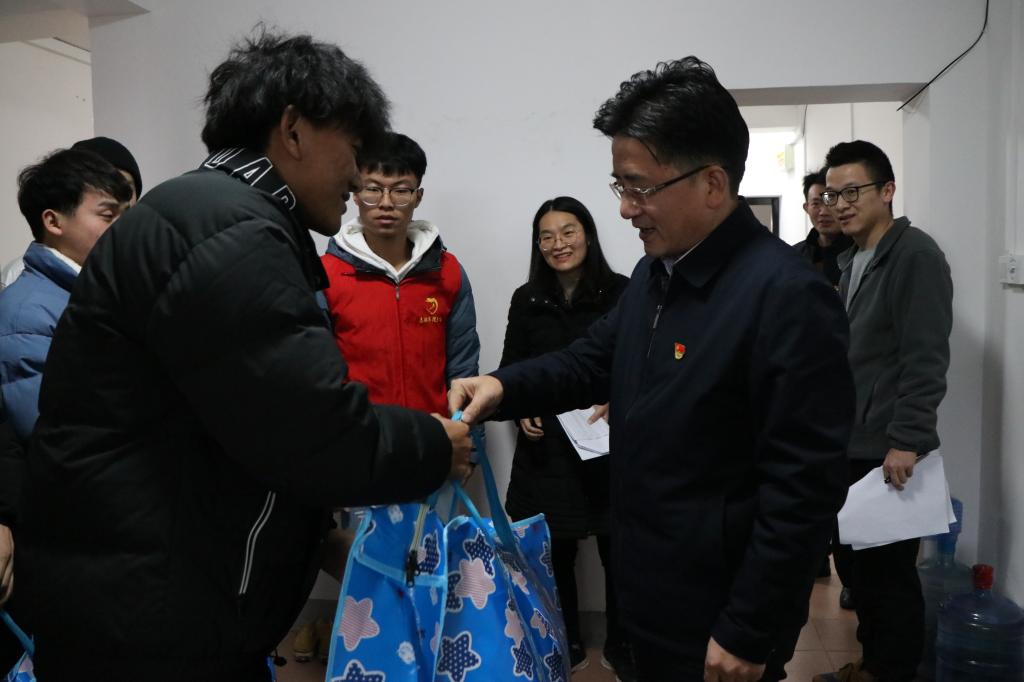 张董事长在宿舍与员工们亲切交流,关心了解员工学习和生活状况,并亲手向员工们送上棉被。一床床棉被虽轻,但却饱含着公司领导对同学们沉甸甸的关怀。“宿舍冷不冷?”“伙食怎么样?”“期末复习的怎么样?”每到一间宿舍他都关切的问到。了解到同学们虽然来自五湖四海,但能很和睦相处在一起学习和生活,他感到很欣慰。他还叮嘱同学们在冬季注意保暖,适当锻炼身体,保持良好的卫生习惯。