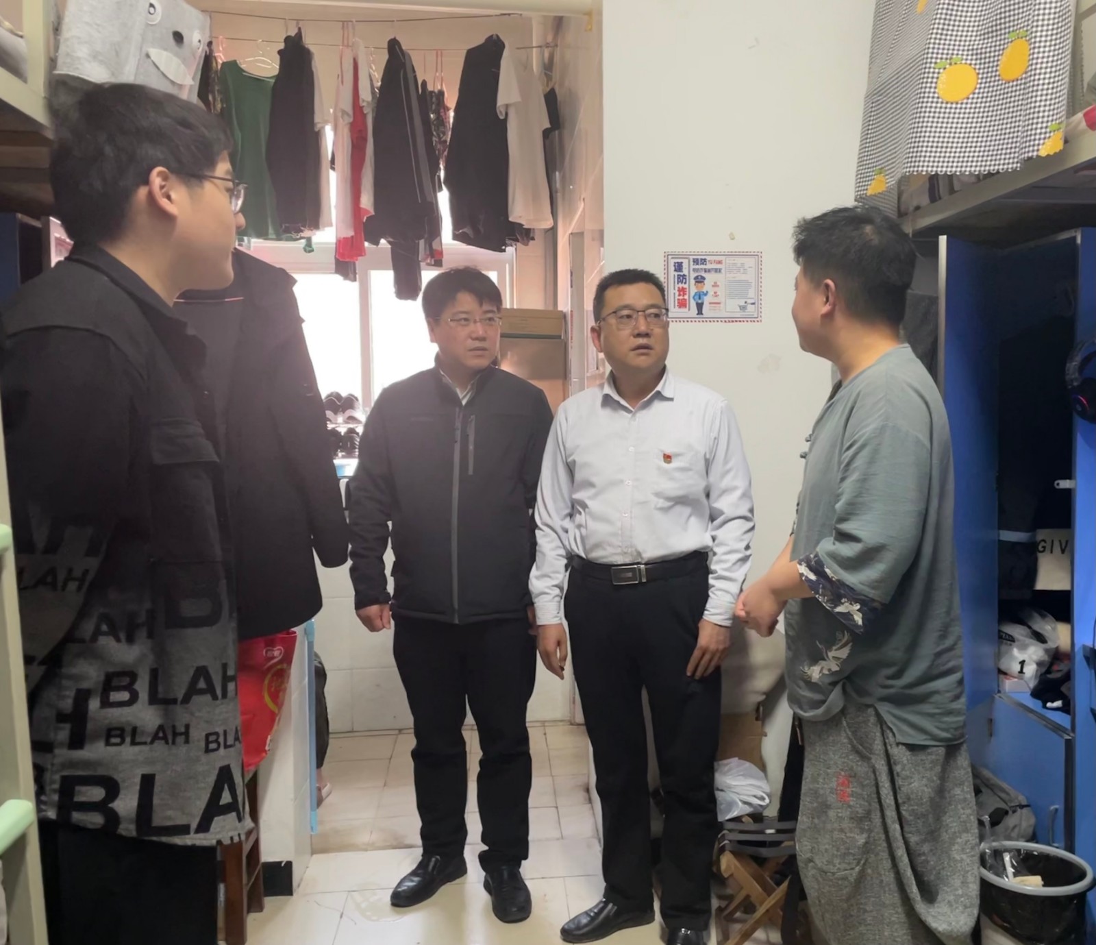 在李四北毕业生宿舍的走访过程中,胡明茂、杨亚会与大四员工们亲切地交谈,重点关注了毕业设计进度以及毕业论文撰写中遇到的实际困难。认真询问了他们的就业去向,深入了解每一位同学的就业、考研情况,并提醒未就业的同学密切关注公司及企业发布的招聘信息,积极就业,树立正确的就业观,谨防就业陷阱。随后,在李五B新生宿舍走访时,重点了解了大一员工的思想、学习与生活情况,胡明茂强调说到:“大家要勤奋学习、打牢基础,主动了解掌握学科前沿和员工动态,做好学业规划,合理分配时间,积极参加学科竞赛,不断提升专业素养和创新实践能力。也要保持宿舍卫生干净整洁,养成良好生活习惯,做高素质的车院青年。”同时,杨亚会也反复叮嘱大家:“五一假期务必把安全放在第一位,无论是出行还是留校,都要时刻紧绷安全弦,特别要谨防电信网络诈骗。”