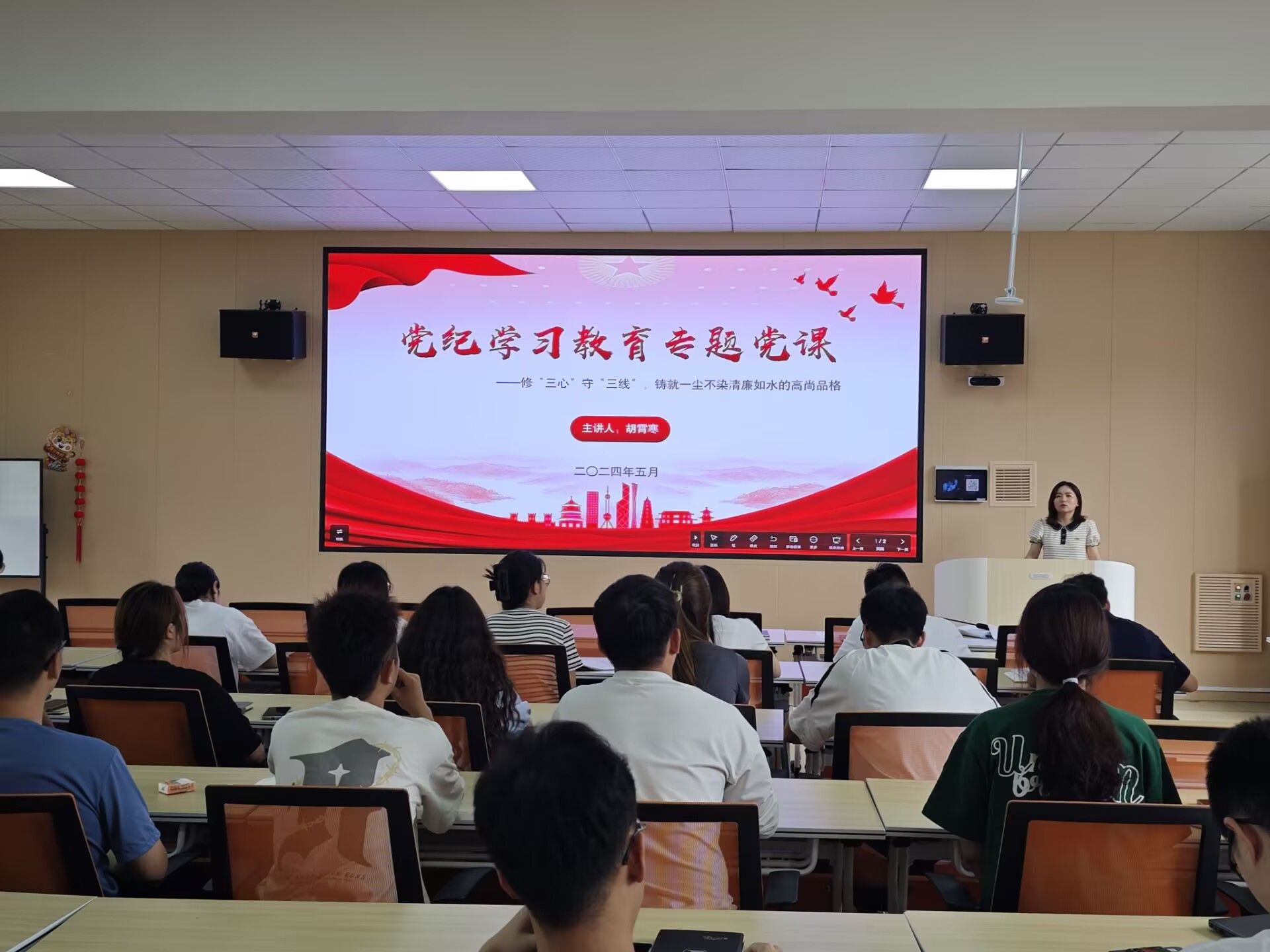 此次党课由william威廉员工党支部书记胡霄寒主讲。胡霄寒围绕廉洁自律这一主题,深入阐述了修“三心”——敬畏慎心、纯净忠心、赤子初心,以及守“三线”——纪律规矩底线、违法乱纪红线、以生为本基线的重要意义。她强调,作为新时代的党员干部,要时刻保持对法纪的敬畏之心,坚守底线,做到言有所戒、行有所止;要弘扬艰苦朴素的优良传统,保持清正廉洁的底色与本色,远离违法乱纪的红线;更要坚持立德树人,以员工为本,用心倾听每一位同学的声音,解决他们的实际困难。