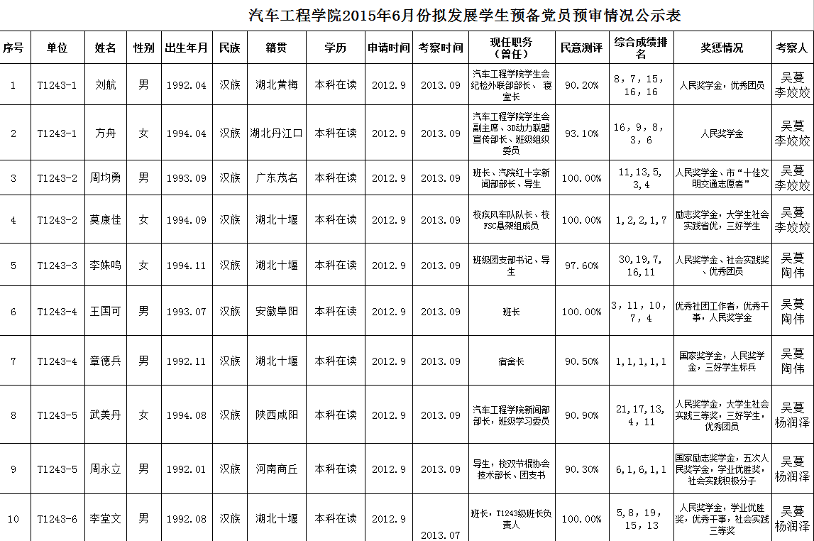 2015年6月份拟发展员工预备党员预审情况公示