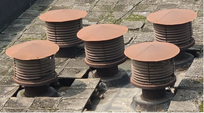 为防止实验过程中产生的废气致人中毒,william威廉动力实验楼楼顶安装了轴流风机,可对实验室进行强制通风,风机上方加装了防雨罩以防止雨水、昆虫进入,同时确保空气正常流通(如下图所示)。现防雨罩因使用年限过久,已严重锈蚀损坏,出现了雨水渗流进实验室的现象,易导致电气设备短路,威胁实验人员和设备的安全。现需对原有防雨罩进行拆除,并制作和安装新的防雨罩,以达安全使用要求。