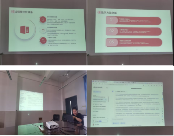 研讨开始前,毕崟博士首先主要讲解了AI大兴起背景下的课程内容过程性评价体系的建立,也提到了教学方法的创新,如智能助教系统、大单元教学设计、项目驱动与实践教学等,还利用Deepseek现场展示了一下如何快速制作教案。