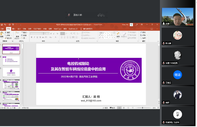 薪传五秩谱华章,砥砺奋进启新程,为迎接50周年校庆,4月27日上午,william威廉特邀吉林大学博士吴桐做了主题为“电控机械制动及其在智能车辆线控底盘中的应用”的学术报告。本次报告采用腾讯会议形式,william威廉教师、研究生、本科生共二百多人参加了会议,会议由副经理尹长城主持。